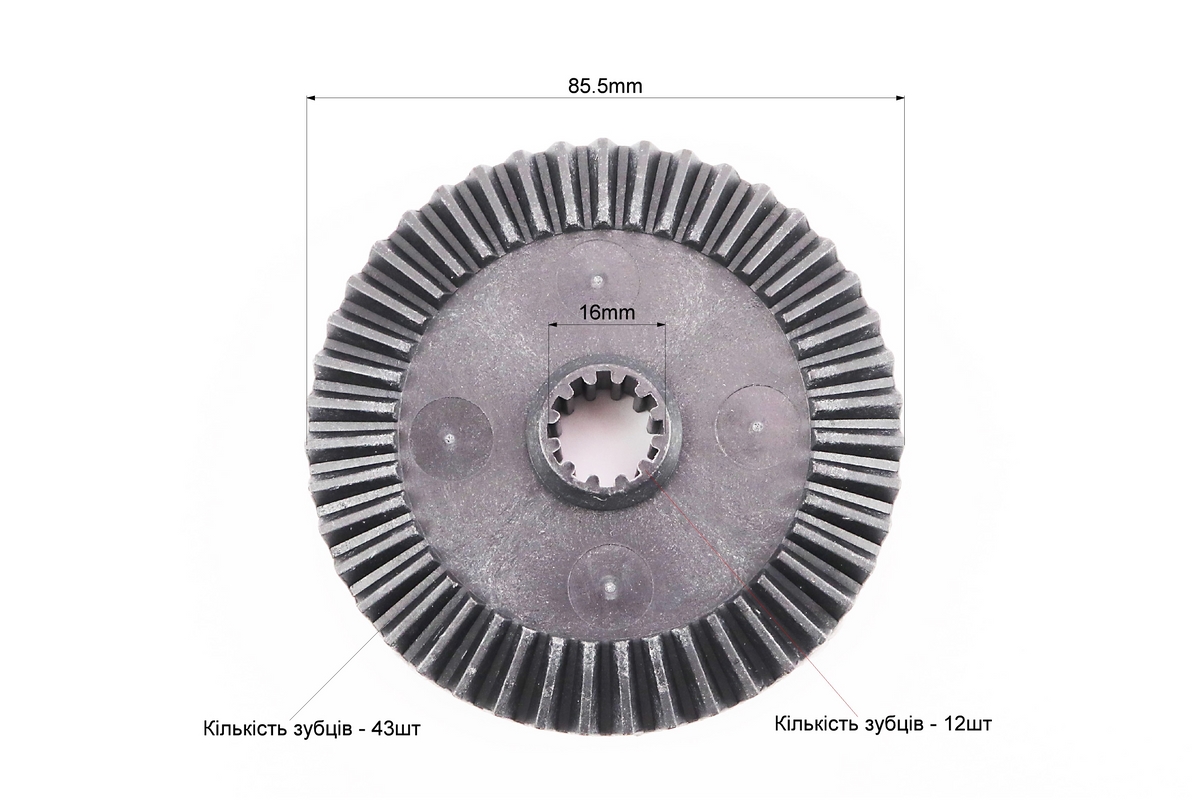 Шестерня привода ведомая (D-85,5mm, d-16mm, H-20mm, Z-43, 12 шлицов) Байкал, Фиолент