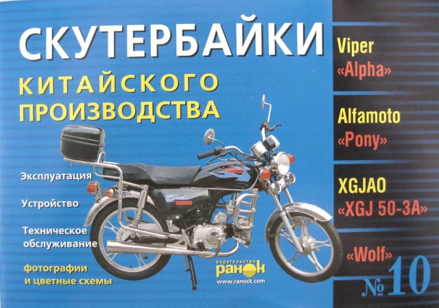 7. В настоящем издании описано техническое обслуживание следующих моделей скутербайков (мопедов), выпускаемых фирмой ZONGSHEN и ALFAMOTO: Viper «Alpha»; Alfamoto «Pony». Эти же модели могут продаваться также под брендами XGJAO «XGJ 50-3A», «Wolf» и др. В издании глубоко исследуются вопросы технического обслуживания и ремонта узлов и агрегатов вышеуказанной техники, которые подробно сопровождаются качественными фотографиями и иллюстрациями. Освещаются основные технические параметры, соответствия запчастей зарубежных производителей отечественным аналогам, алгоритмы поиска и устранения неисправностей, дана подробная цветная схема электрических соединений.