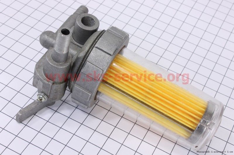 Кран топливный + фильтр в пластмассовом, прозрачном корпусе (вход/выход в сторону)