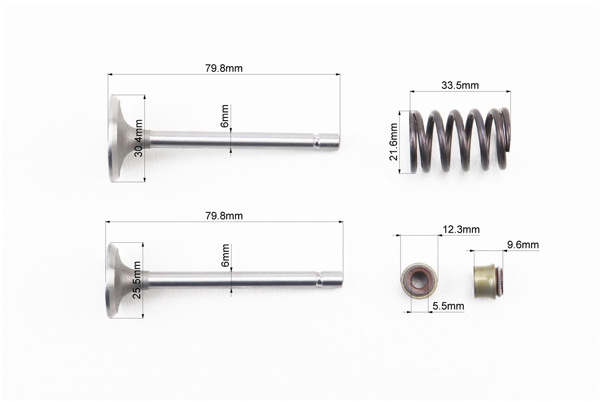 Клапан впускний (h-79,8; D-30,4; d-6), випускний (h-79,8; D-25,5; d-6) к-кт 2шт 178F + пружина-2шт + шайба -4шт + сухар-4шт