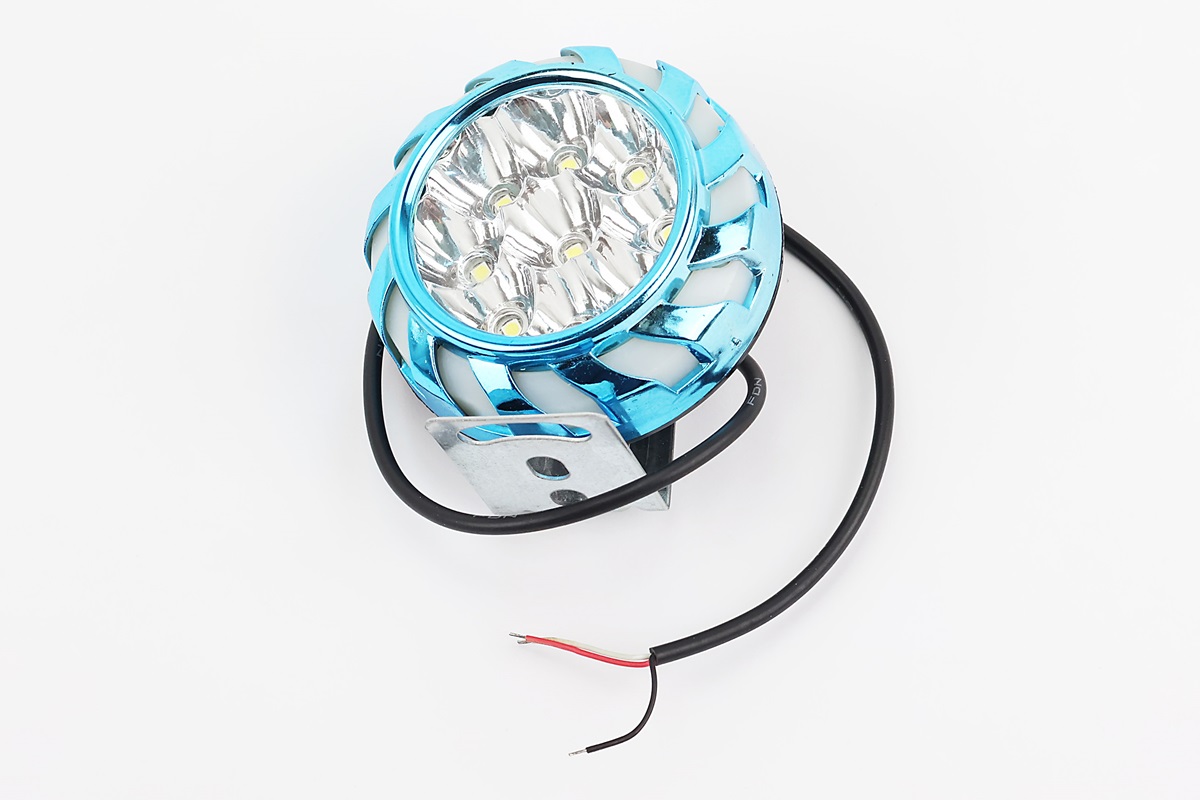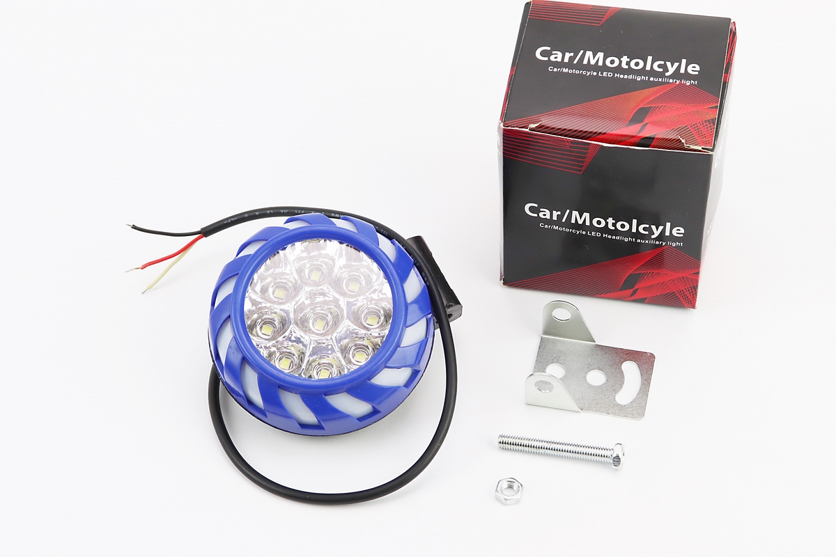 Фара дополнительная светодиодная влагозащитная — 9 LED с креплением, 70мм с стробоскопом и разноцветной подсветкой, голубой бортик