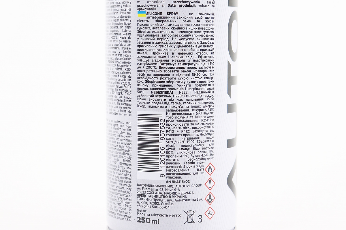 Смазка силиконовая, водоотталкивающая "SILIKONE SPRAY", Аэрозоль 250ml