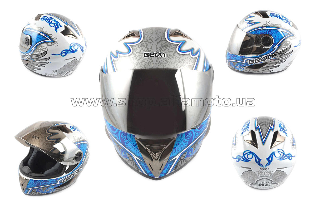 Шлем-интеграл (mod:B-500) (size:L, бело-синий, зеркальный визор, DARK ANGEL) BEON