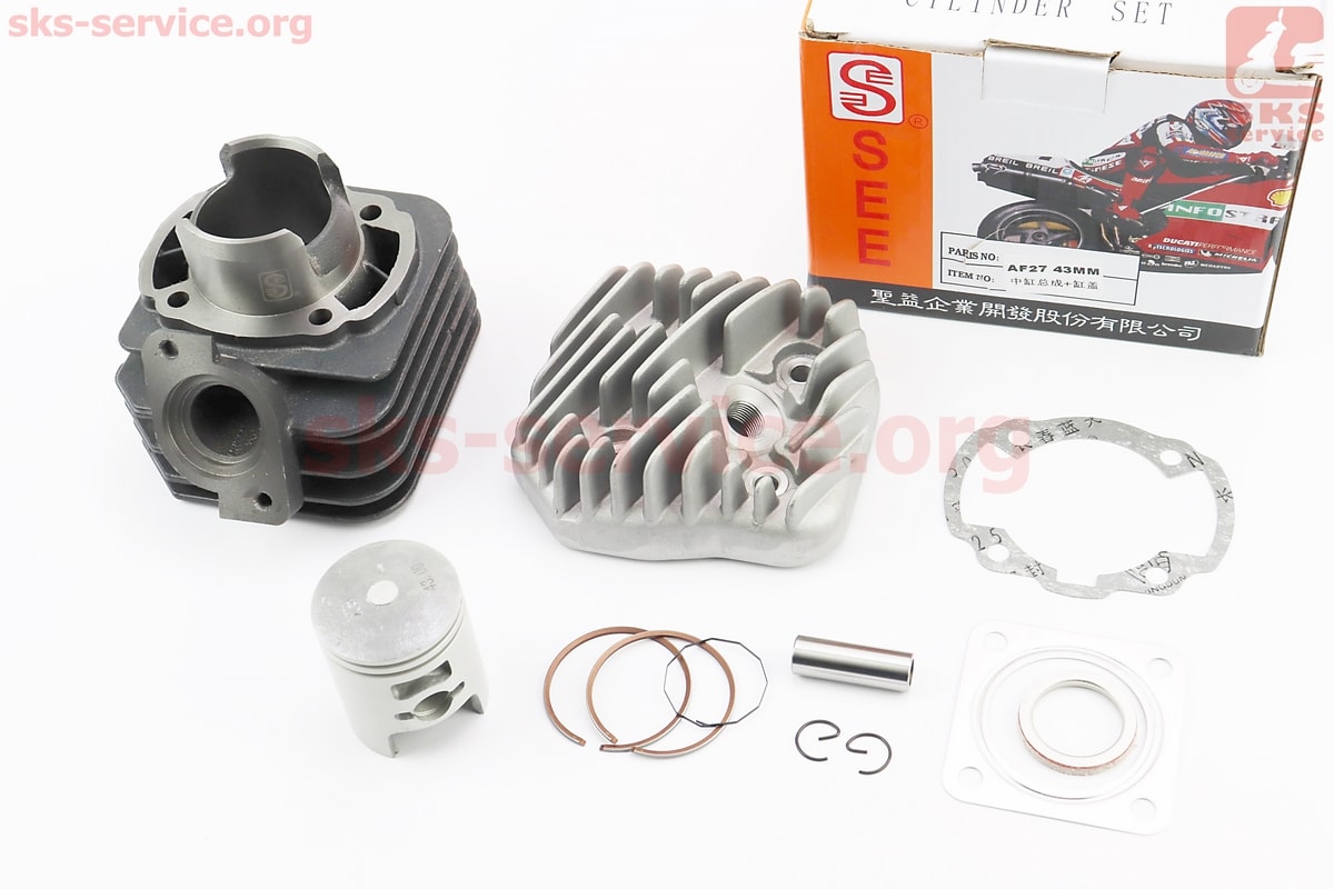 Циліндр к-кт (ЦПГ) Honda DIO AF27 65cc-43мм (палець 12мм) + головка, жовта коробка (AF18, AF25, AF28 DIO; AF24, AF30, AF31, AF51 TACT; LEAD20; FIT)